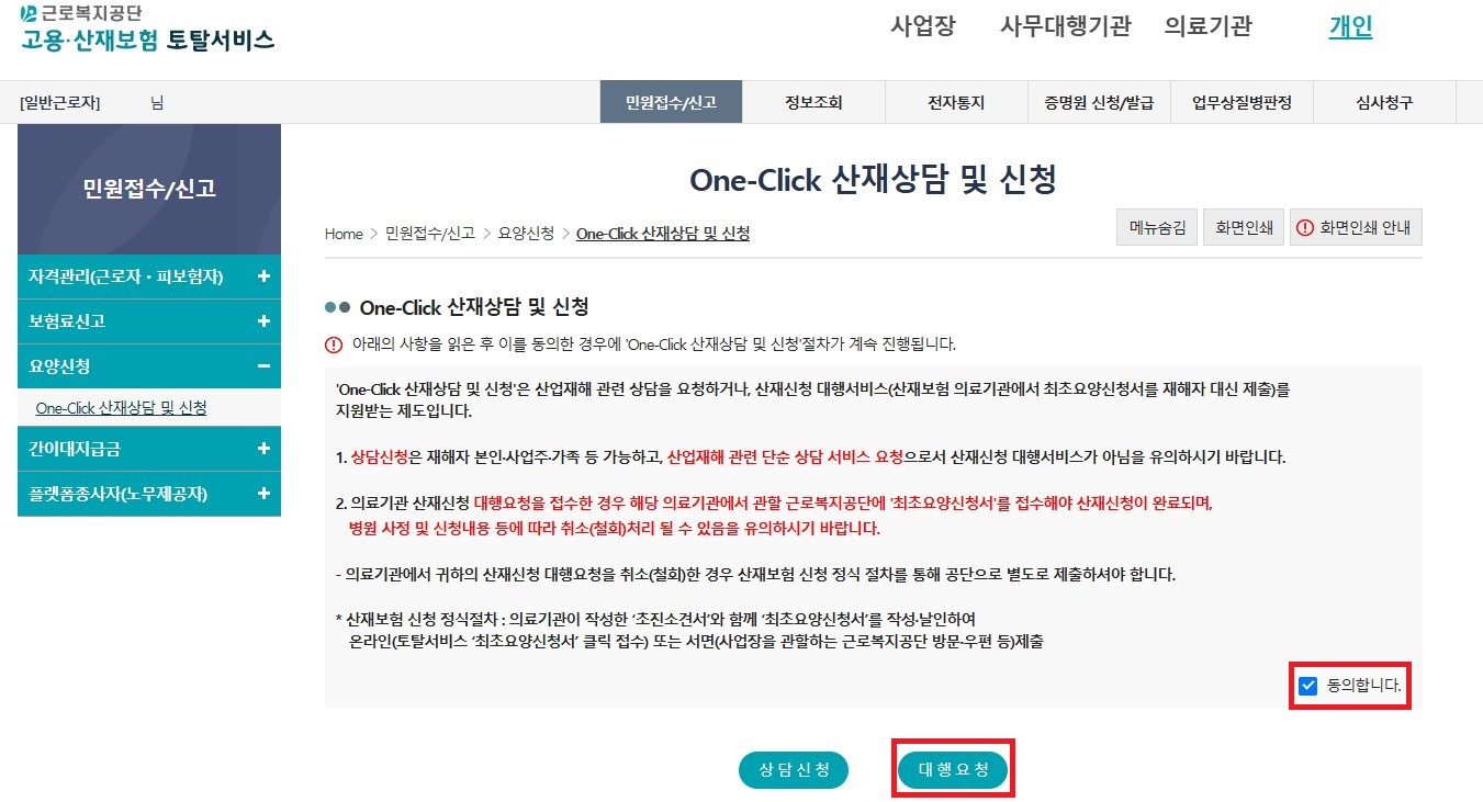 3. One- Click 산재상담 및 신청을 클릭하고 '동의합니다'에 체크한 후 대행요청을 클릭한다.