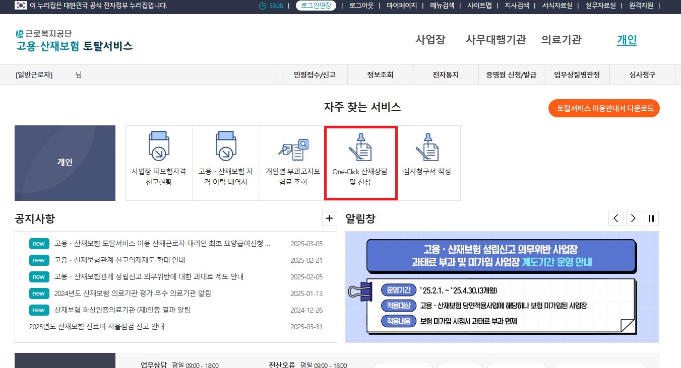 • One-Click 산재상담 및 신청을 클릭한다.
