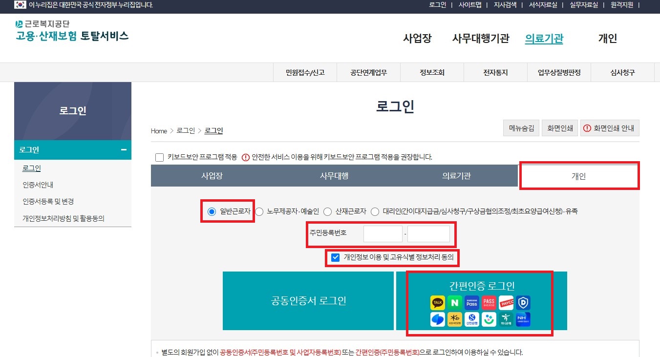2. 개인에서 일반근로자를 체크한 후 주민등록번호를 입력하고 동의에 체크한 후 인증서로 로그인을 한다.